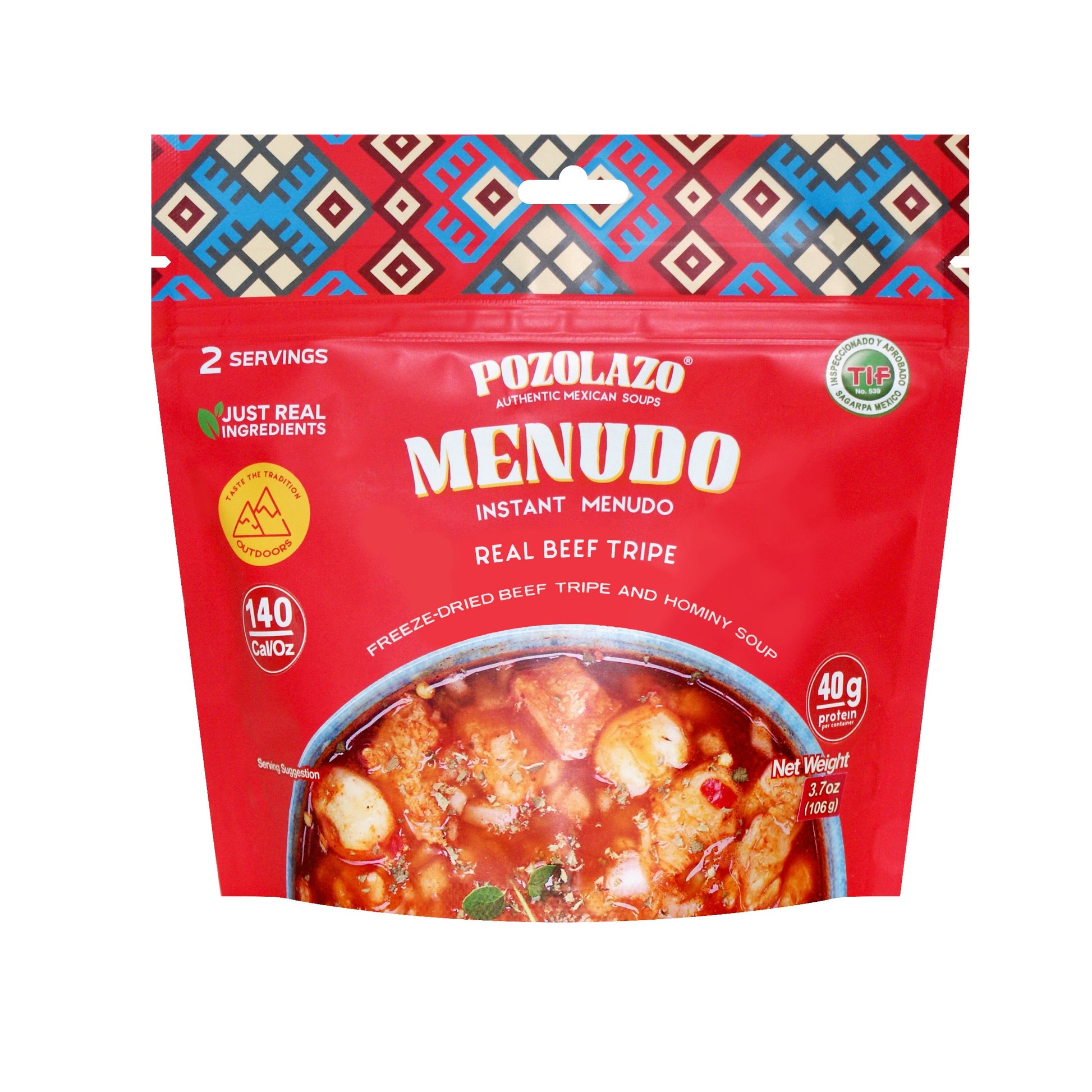Bold, traditional Mexican flavor designed for adventure. Our menudo pouch features real beef tripe, hominy, and a rich red chile broth for deep, energizing comfort on the go. Lightweight, packable, and high in protein — just add hot water for a hearty trail-ready meal. Shelf-stable and made with simple, real ingredients — no preservatives, no artificial flavors.